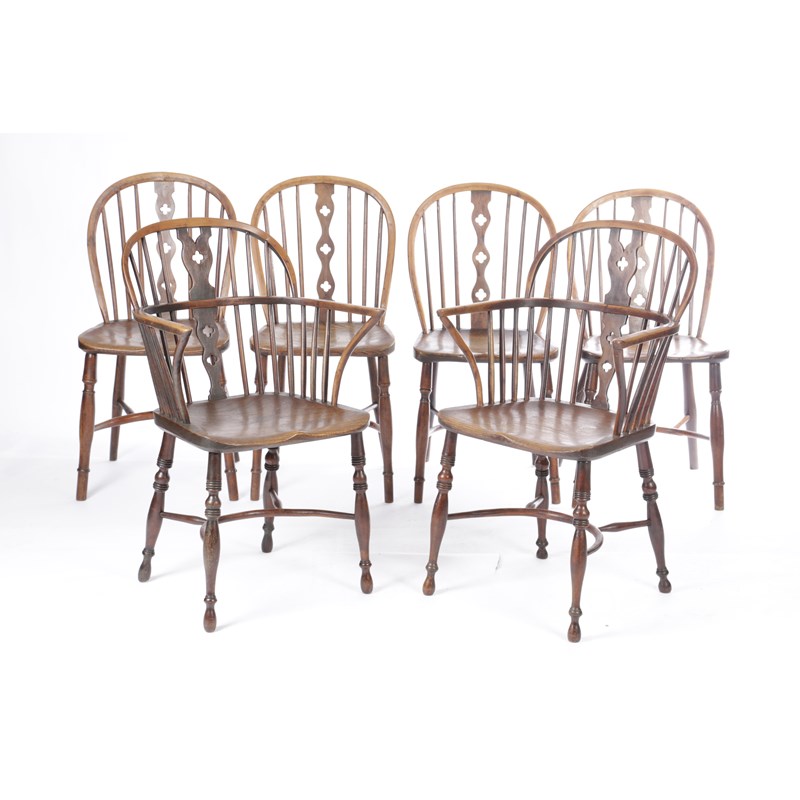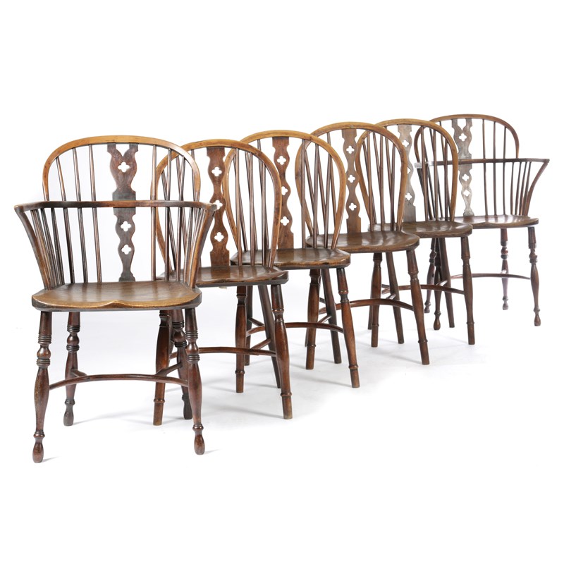 A HARLEQUIN SET OF SIX YEW AND ELM LOWBACK WINDSOR CHAIRS