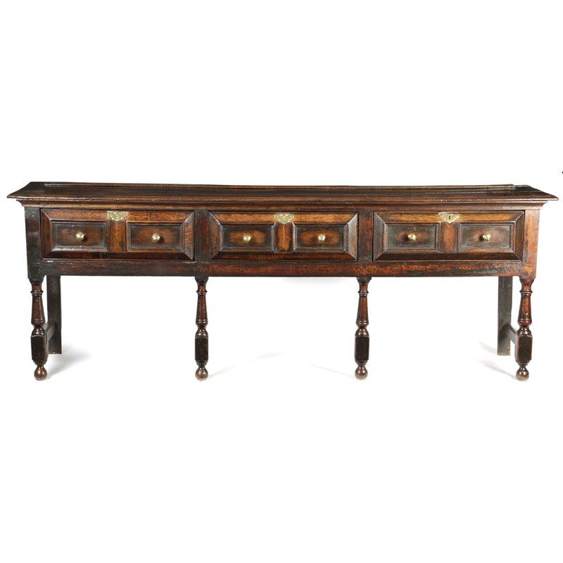 the boarded top above three mitre moulded drawers, on baluster and block front legs
