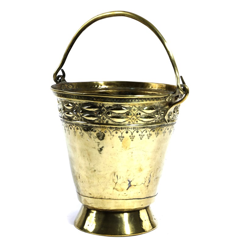 with rolled swing handle, the tapering drum with a bold band of geometric punch decoration to the rim, atop an arcaded design formed of small dots, with an inset splayed deep base skirt with rolled edge