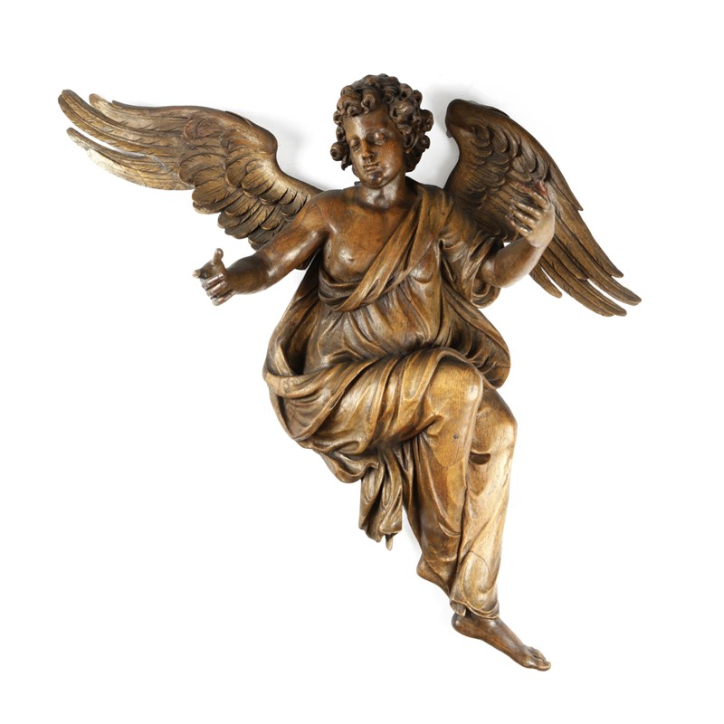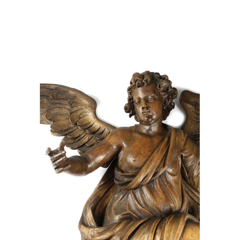 A LARGE FLEMISH BAROQUE CARVED OAK FIGURE OF AN ANGEL