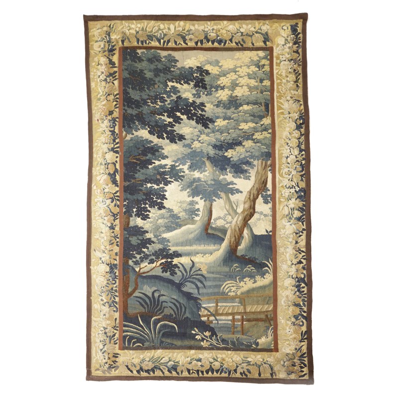 worked in wool and silk, depicting a wooded rural scene, enclosed by borders of rich floral meandering vines, flanked by plain guard stripes