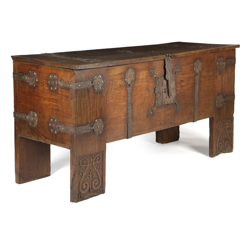 This type of large standing chest is known as a 'stollentruhe' or studded chest and is thought to have been made from the 15th century. The type has become closely associated with the Westphalia region in central, western Germany.