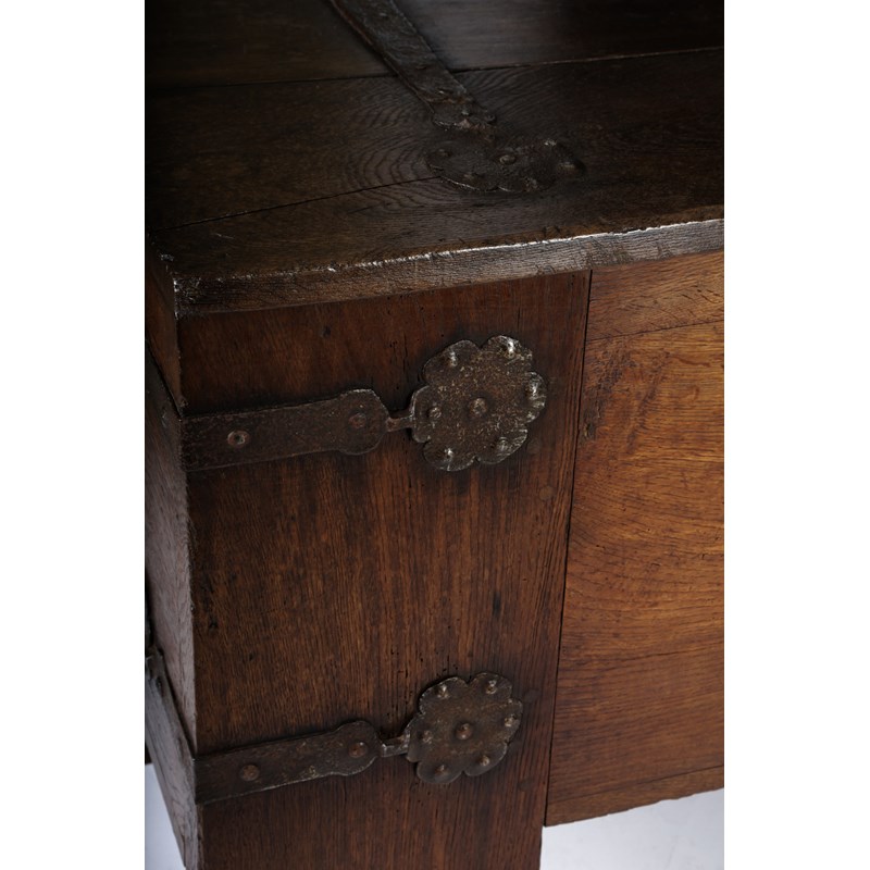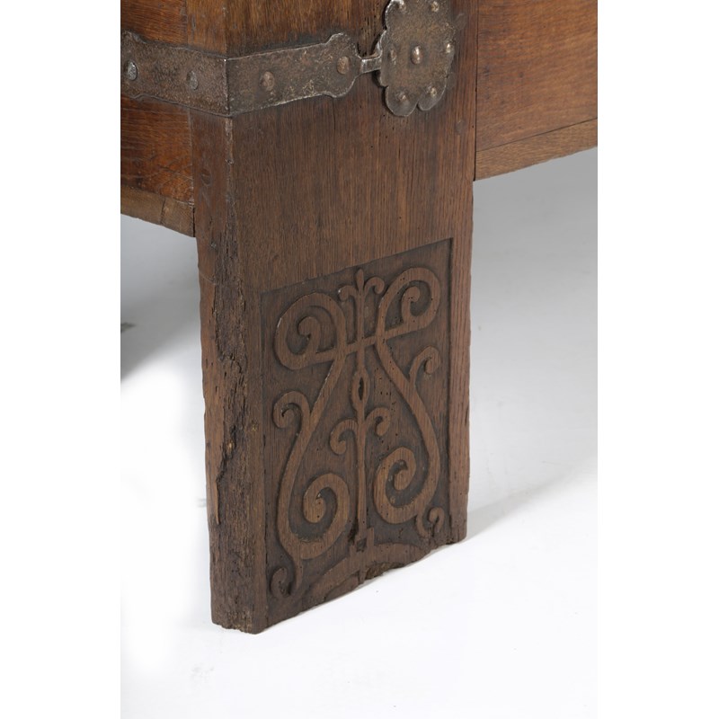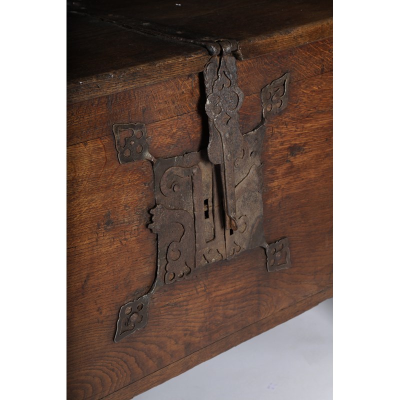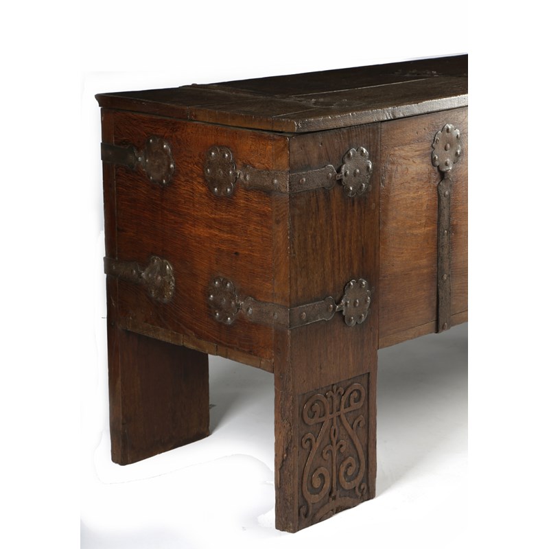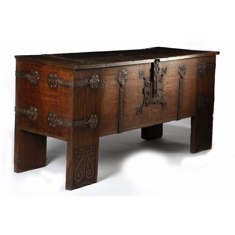 A LARGE GERMAN OAK AND IRON MOUNTED CHEST OR STOLLENTRUHE