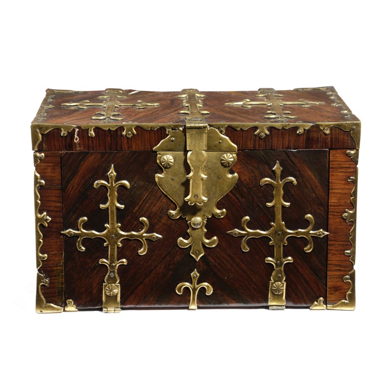 λ A ROSEWOOD AND GILT BRASS MOUNTED COFFRE FORT OR STRONG BOX