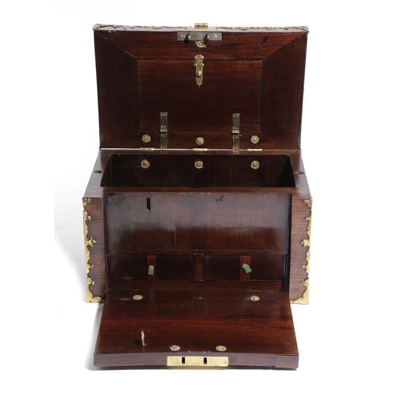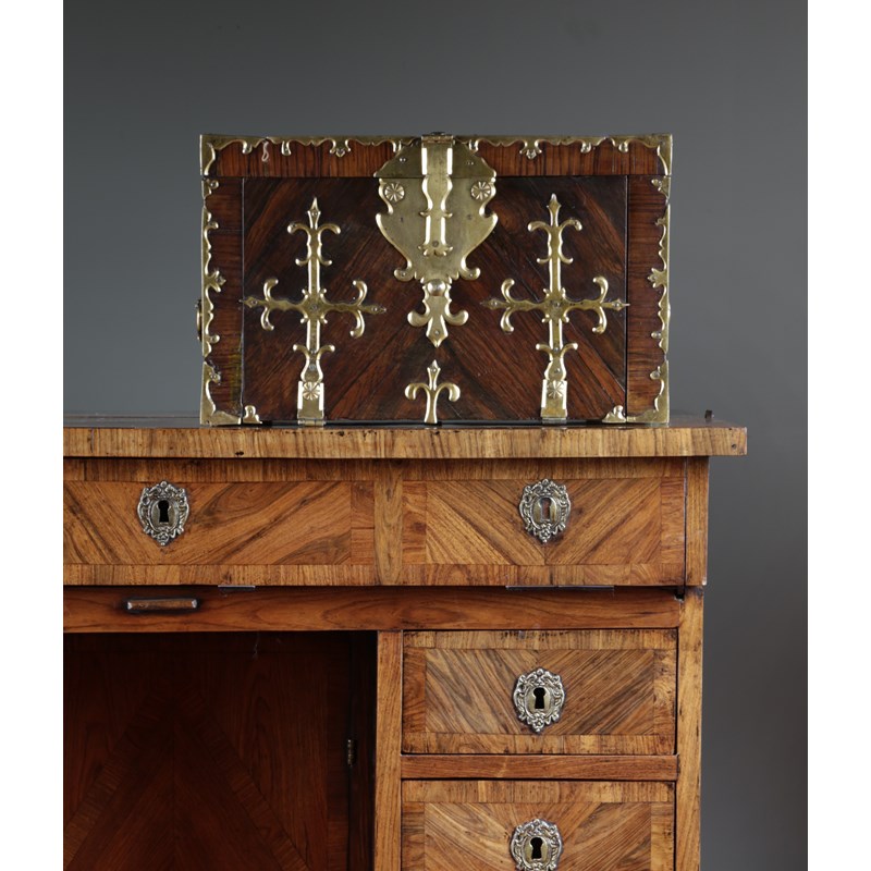 with fleur-de-lys strapwork mounts, the hinged lid and fall front revealing a pair of drawers and a compartment to the underside of the lid with two secret drawers with three secret compartments