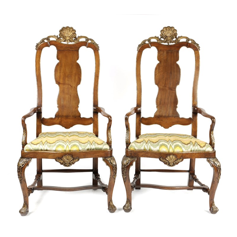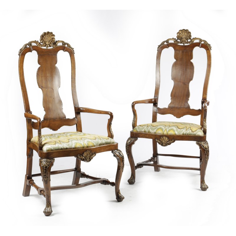 A PAIR OF WALNUT AND PARCEL GILT ARMCHAIRS