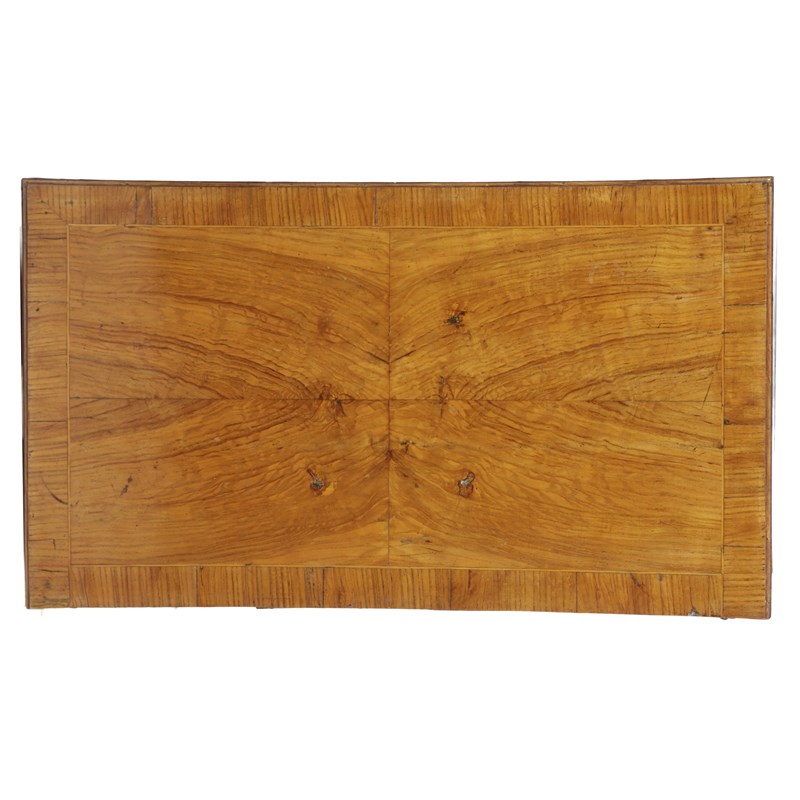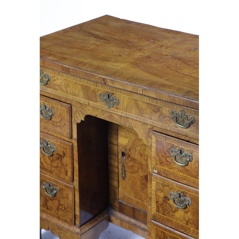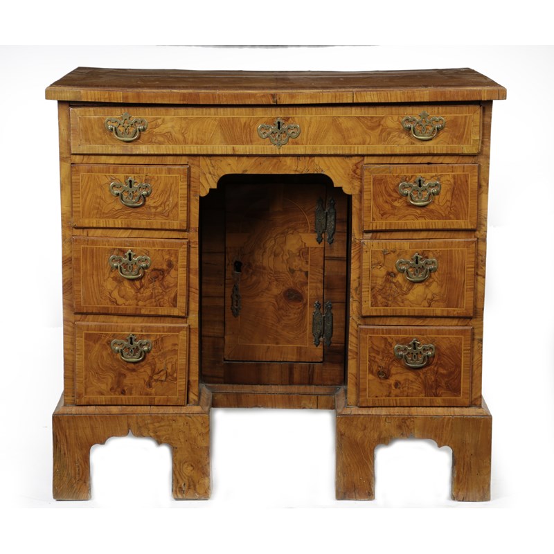 the quarter veneered and crossbanded top above an arrangement of seven drawers around a central cupboard, on archer's bow bracket feet