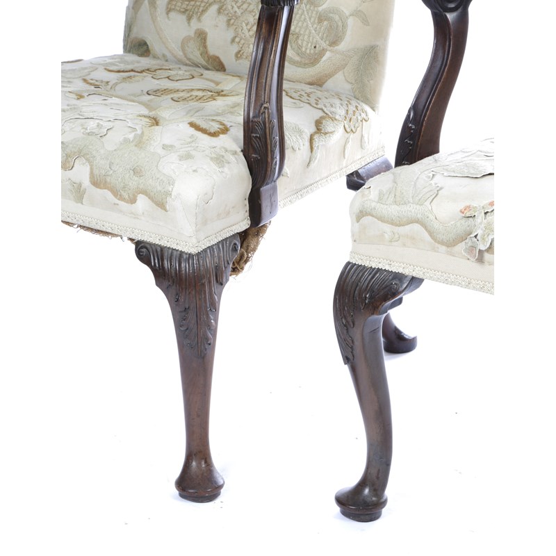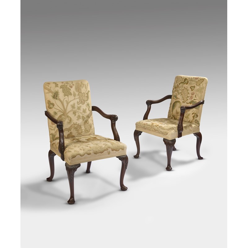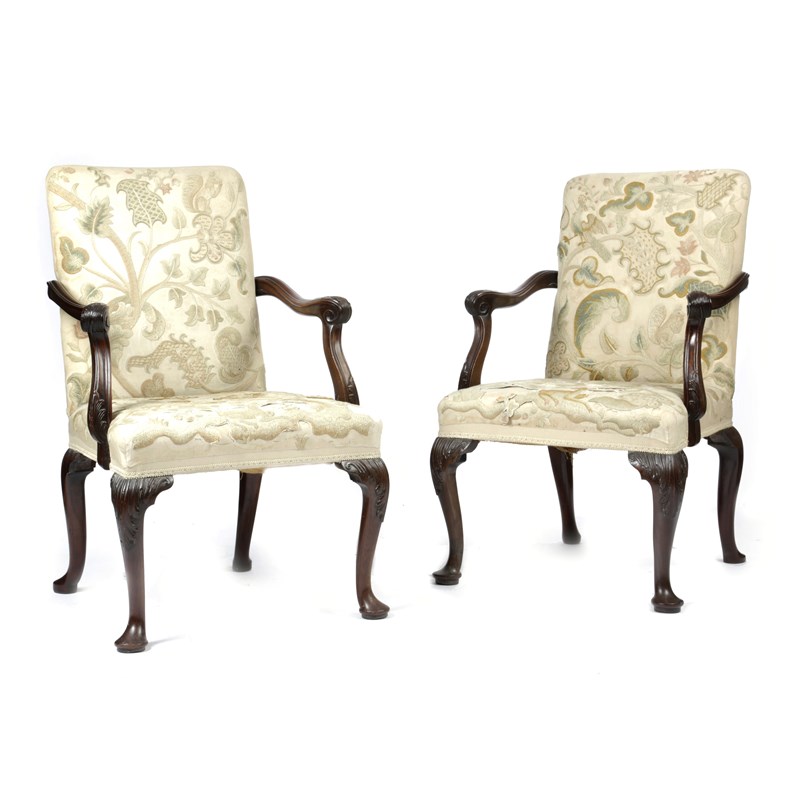 each with a padded back and seat, later covered with crewelwork upholstery, with outscrolling arms finely carved with leaves, on leaf capped cabriole front legs and pad feet, originally on castors (2)