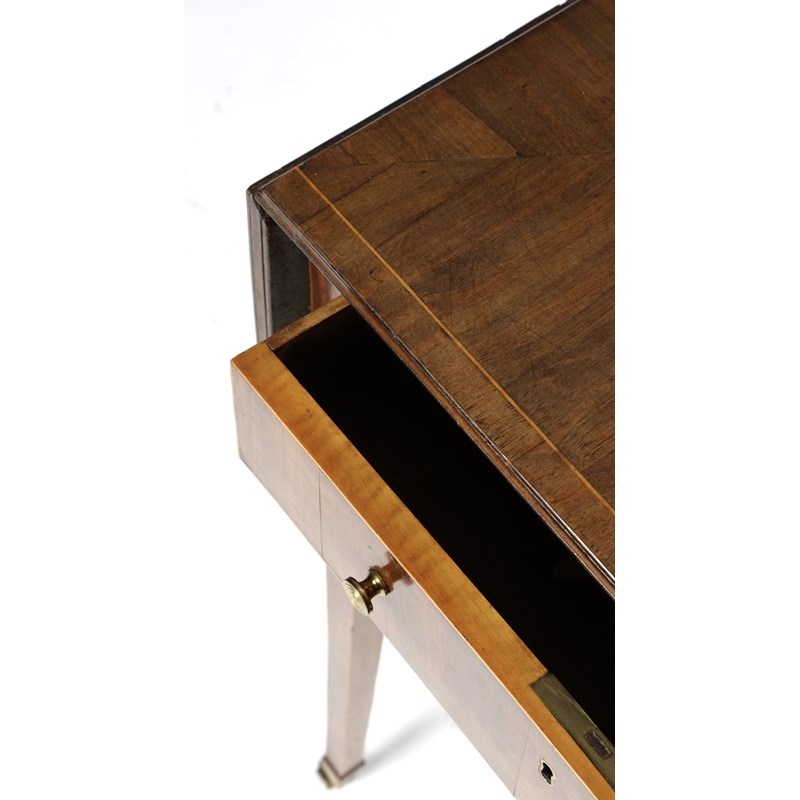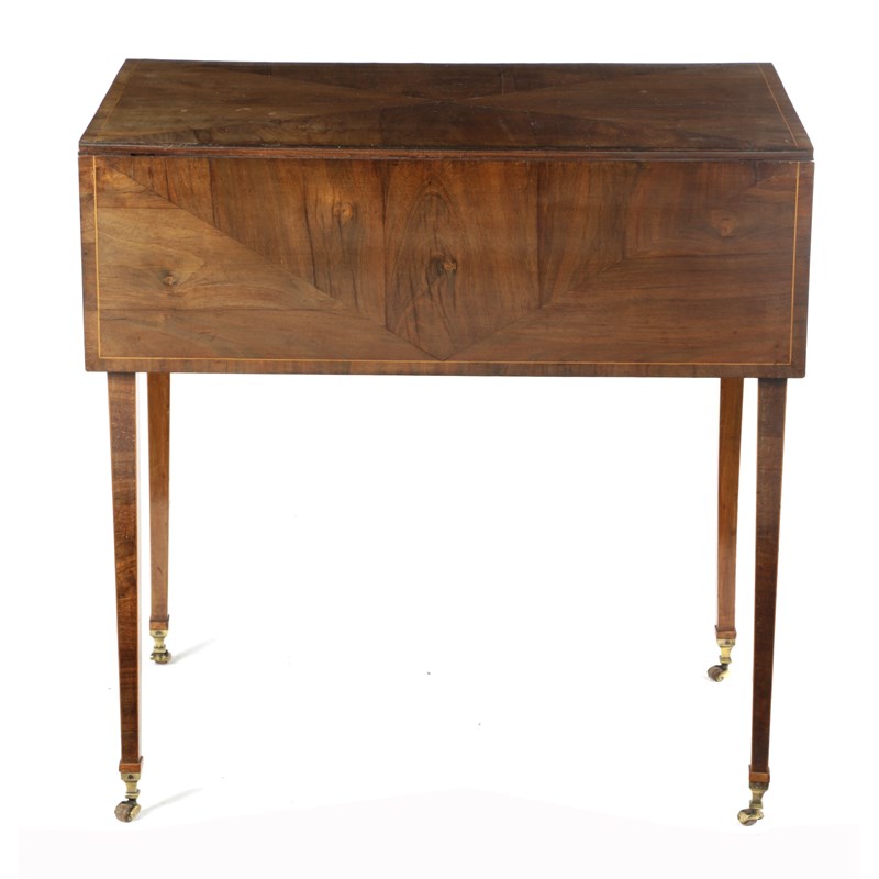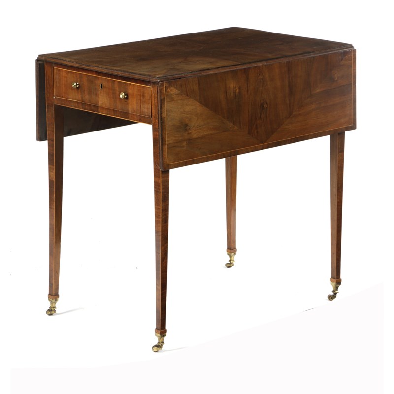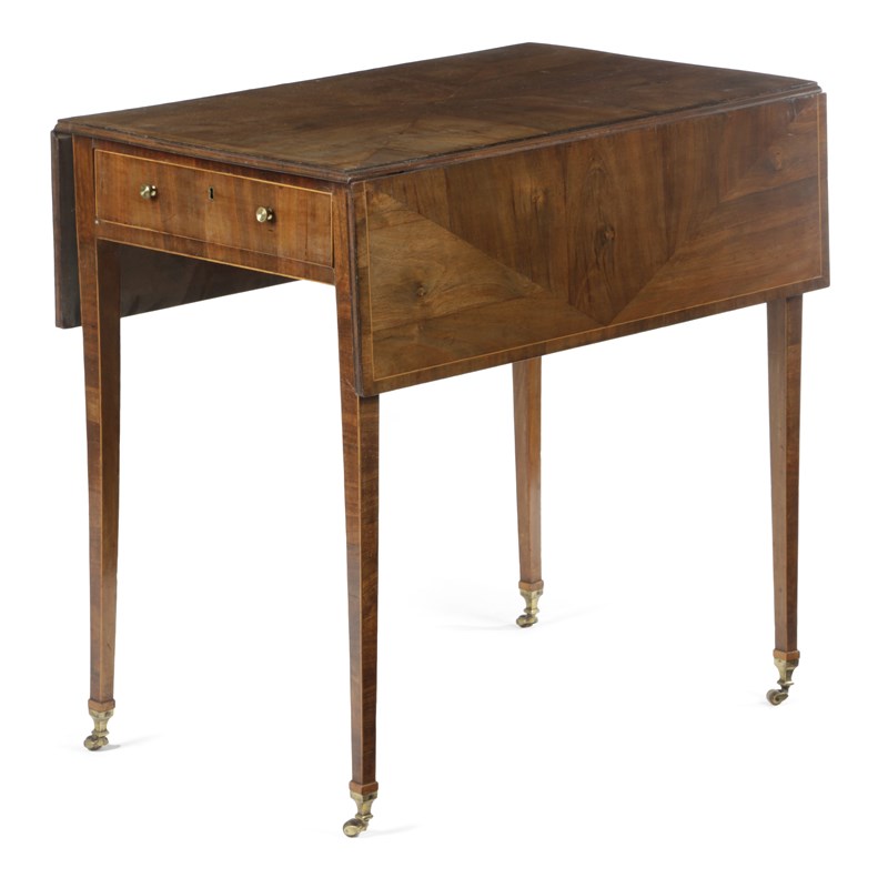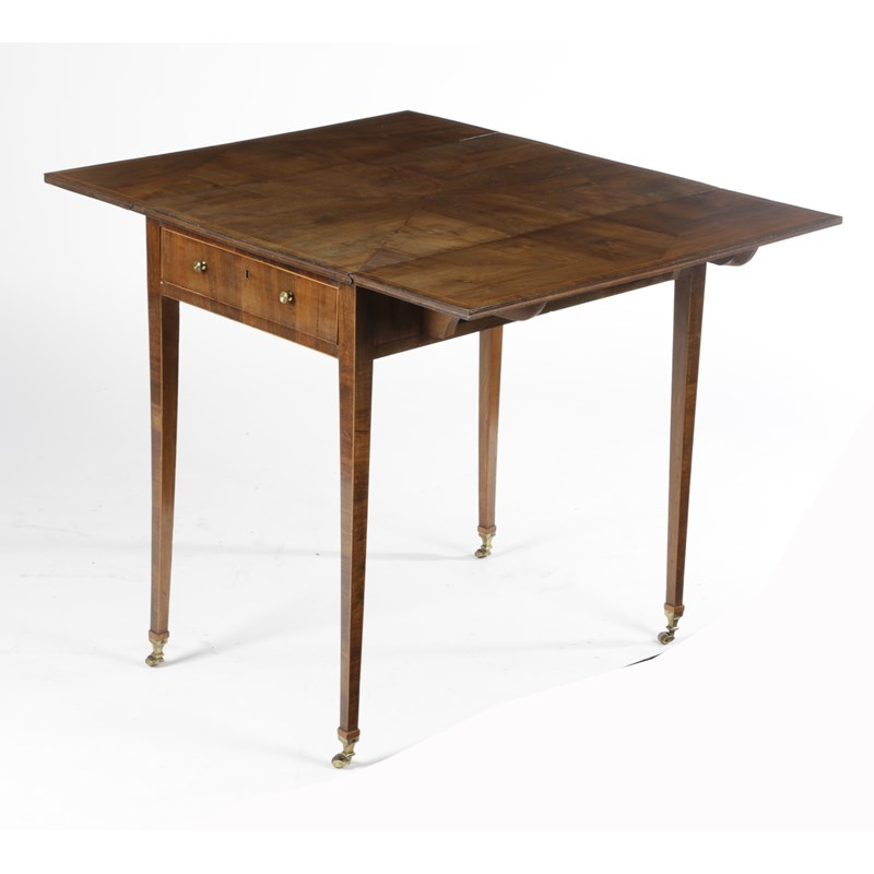 inlaid with boxwood stringing, the crossbanded drop-leaf top with segmented lozenge veneers and a moulded edge, above a frieze drawer and on leather roller castors