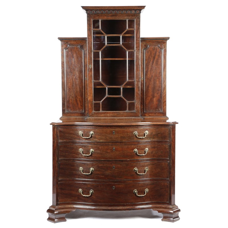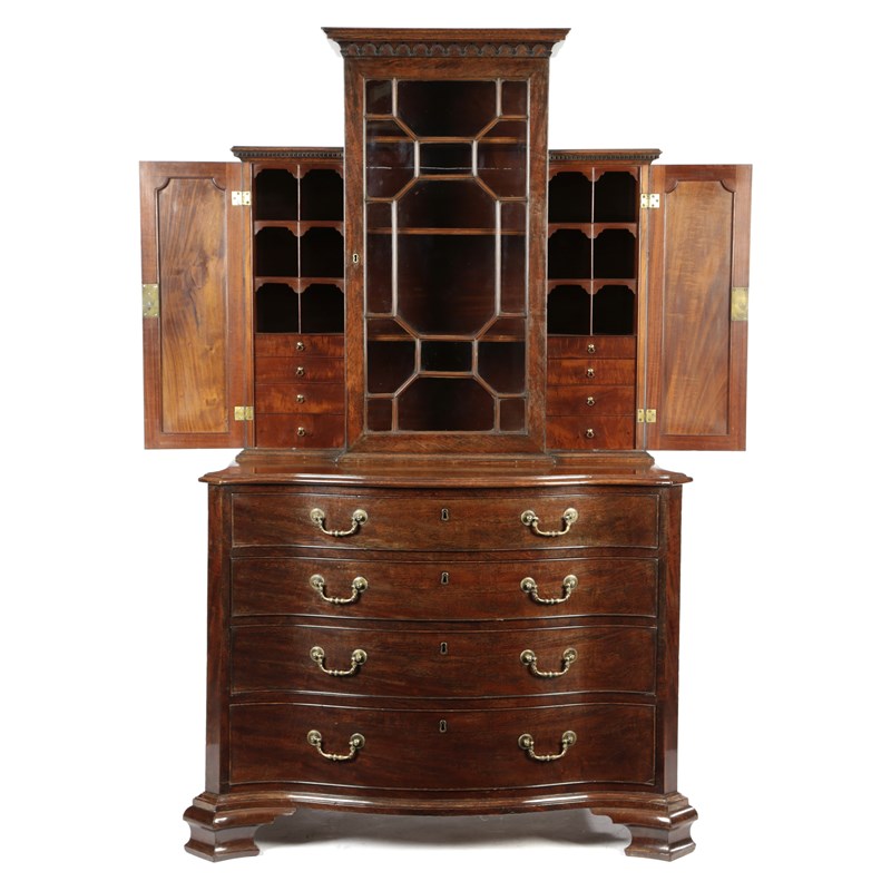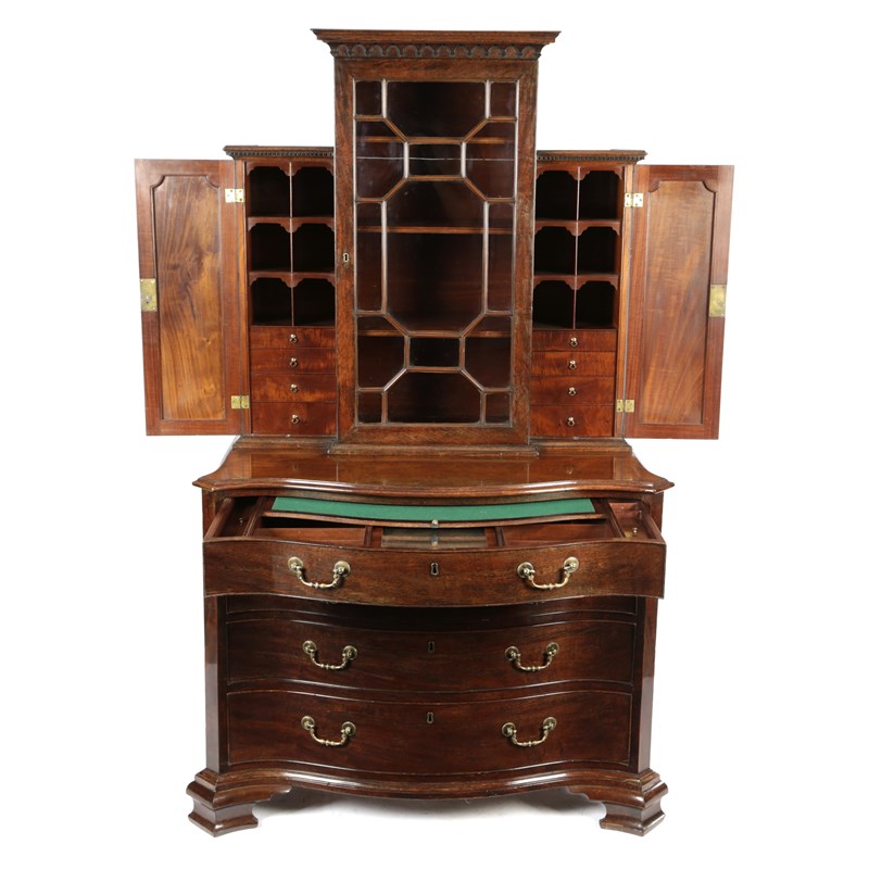 the breakfront top with a geometrical astragal glazed door enclosing adjustable shelves, flanked by a pair of cupboards with outline mouldings each fitted with pigeonholes and four graduated drawers above a serpentine front chest, the top drawer fitted with divisions and lidded compartments with a baize lined slide revealing an adjustable mirror on a ratchet above three long drawers and ogee bracket feet