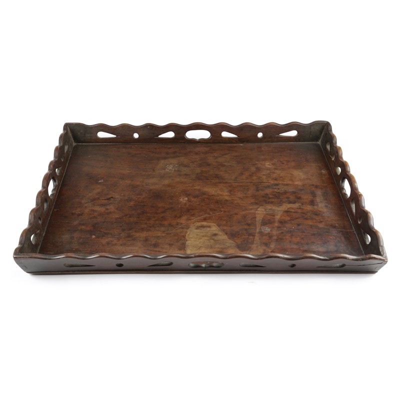 the wavy edged gallery with pierced decoration and four handgrips, with a plum pudding centre