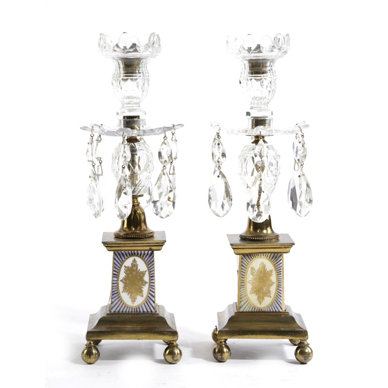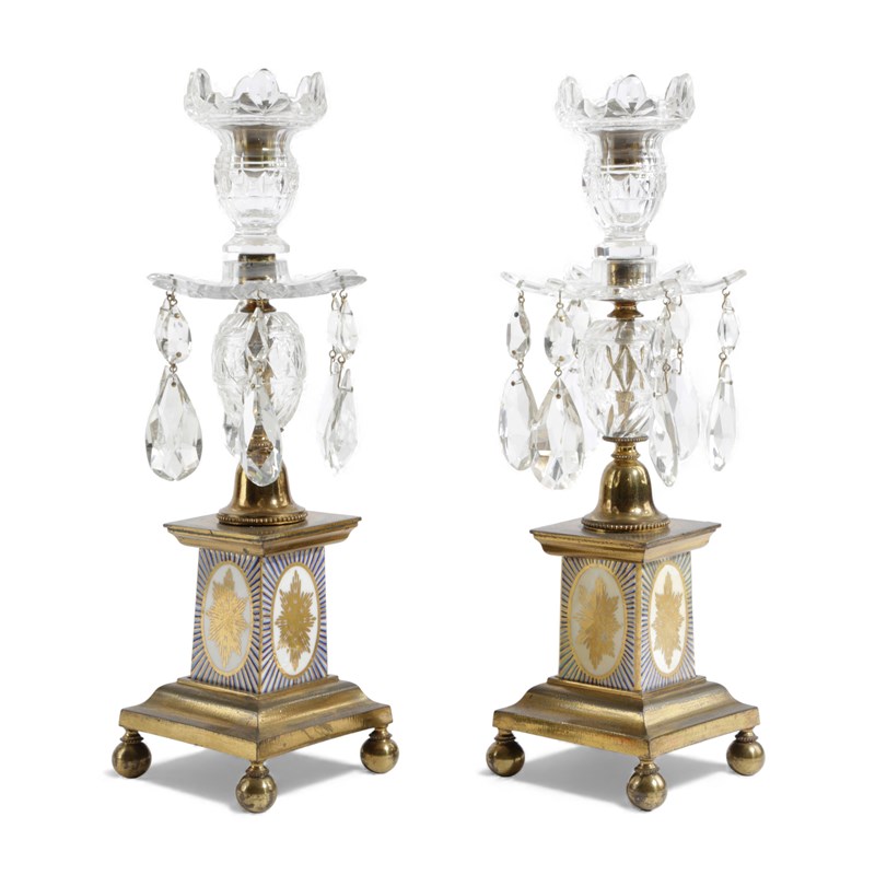 A PAIR OF GEORGE III CUT GLASS AND PORCELAIN CANDLESTICKS