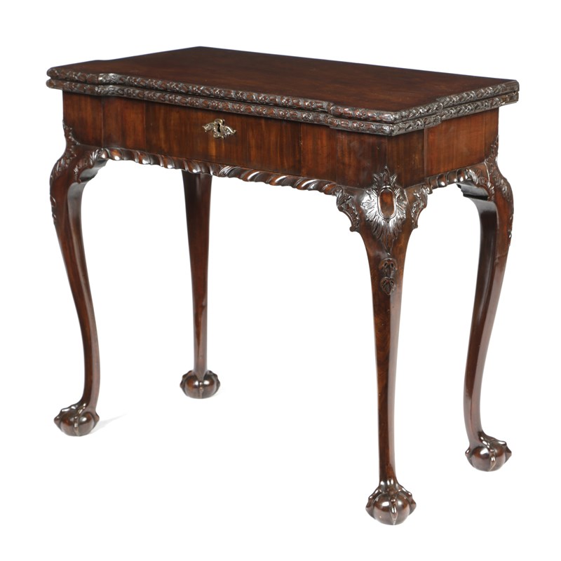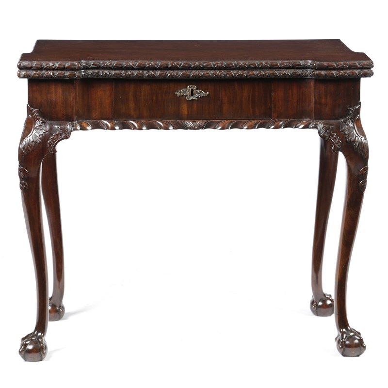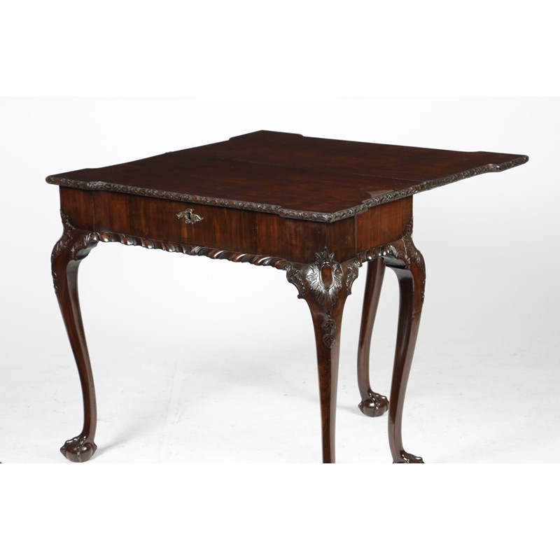 the breakfront hinged fold-over top with a floret and ribbon carved edge above a frieze drawer on cabochon and husk carved cabriole legs and claw and ball feet