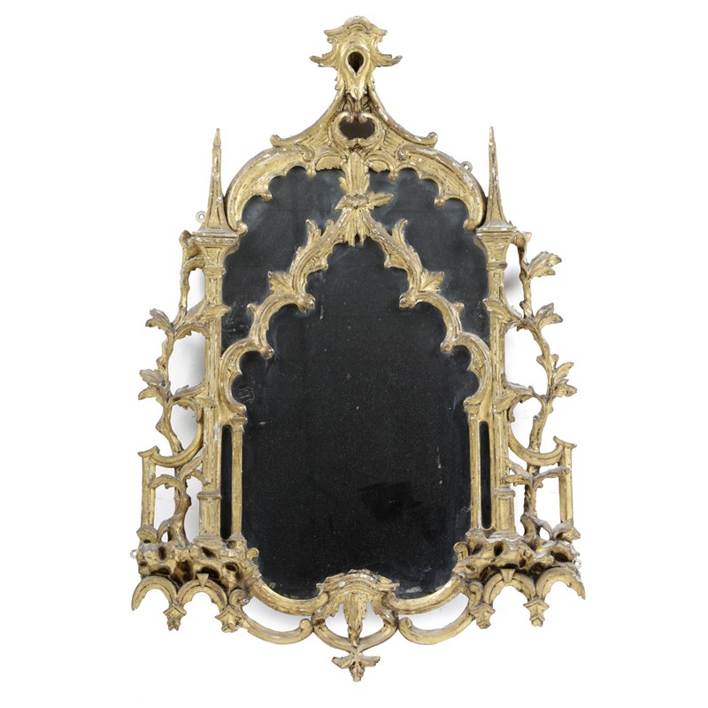 in the Gothic style, the arched plate within a scroll and column frame, flanked by meandering leaves and rockwork