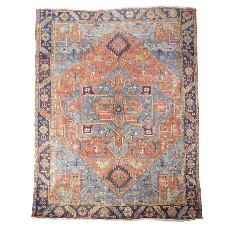 the terracotta field of angular vines, centred by sky blue medallion, enclosed by spandrels and indigo borders of polychrome flowerheads and serrated leaves, flanked by guard stripes