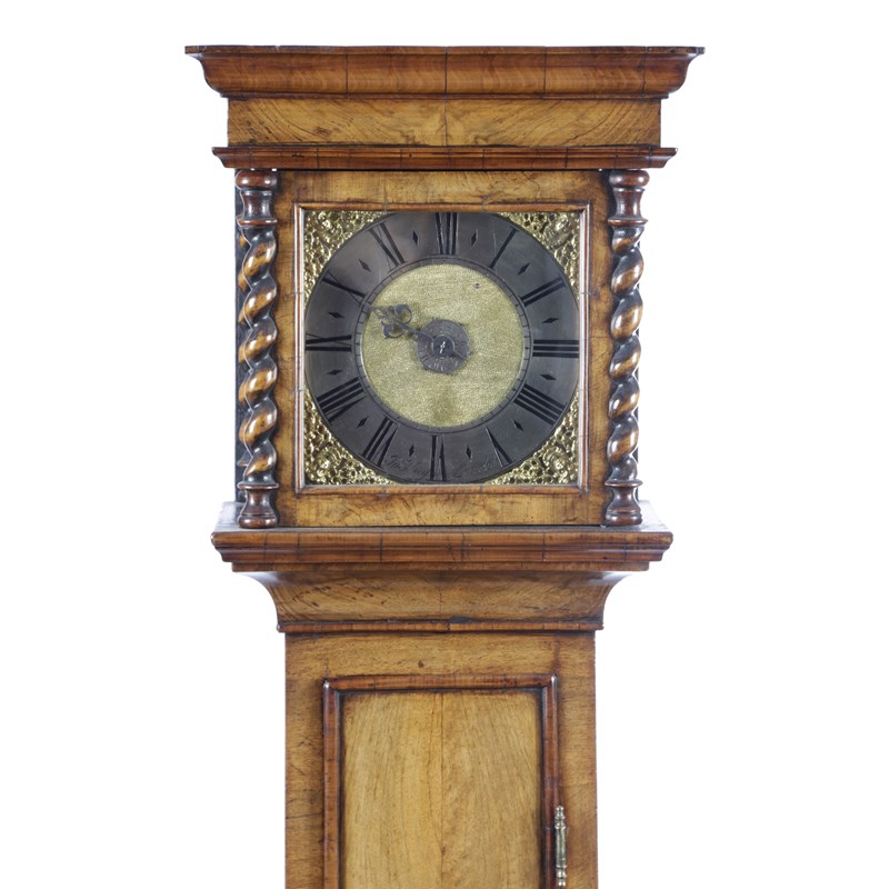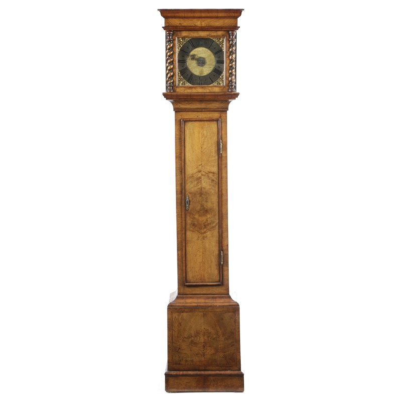 the brass thirty hour movement with an alarm, striking on a bell with a verge escapement, the 8 inch square brass dial with a silvered dial, inscribed 'Jno Kay, London' to a matted centre with alarm dial, the corners with cast maiden head spandrels, the hood with barley twist pilasters above a quarter veneered trunk door, with four brass weights