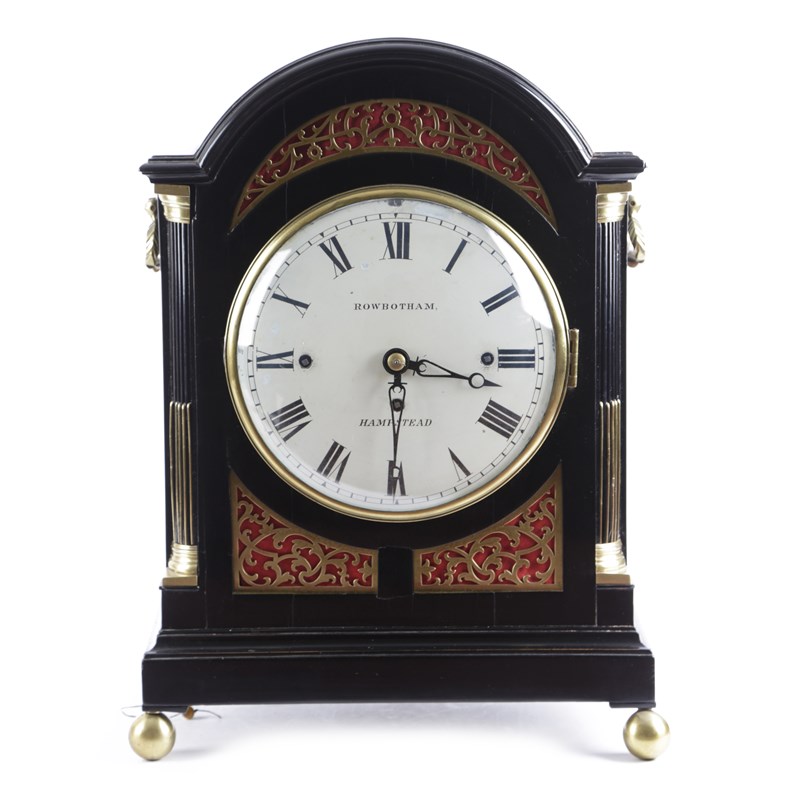 the triple fusee movement with an anchor escapement chiming the quarters on a peel of eight bells and striking the hours on a single bell, the backplate engraved 'Robotham, HAMPSTEAD' to a circular painted dial inscribed 'ROWBOTHAM, HAMPSTEAD' within an ebonised arched case with stop fluted columns, pierced brass front sound frets and side fishscale panels, on ball feet