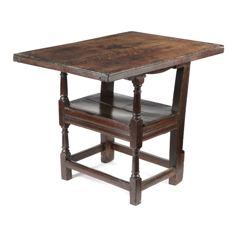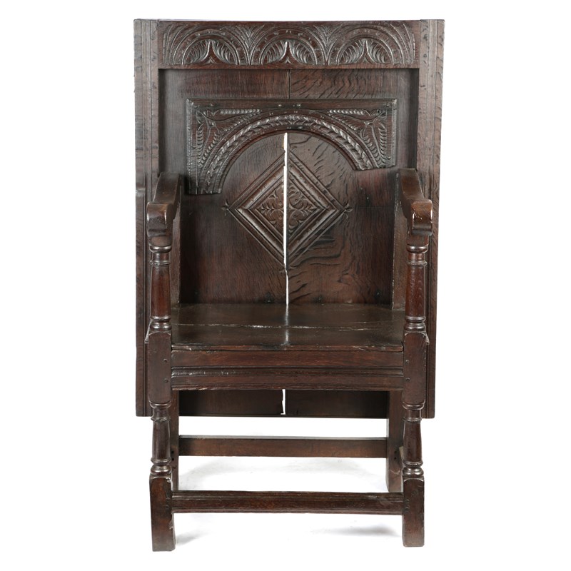 the hinged sliding top with lunette carved band and applied leaf arch above a carved lozenge on turned front legs united by peripheral stretchers, inscribed to the underside 'THIS CHAIR BELONGED TO JOHN BRADSHAWE OF BRADSHAWE HALL DERBY SH PRESIDING JUDGE OF THE TRIAL OF KING CHARLES I'