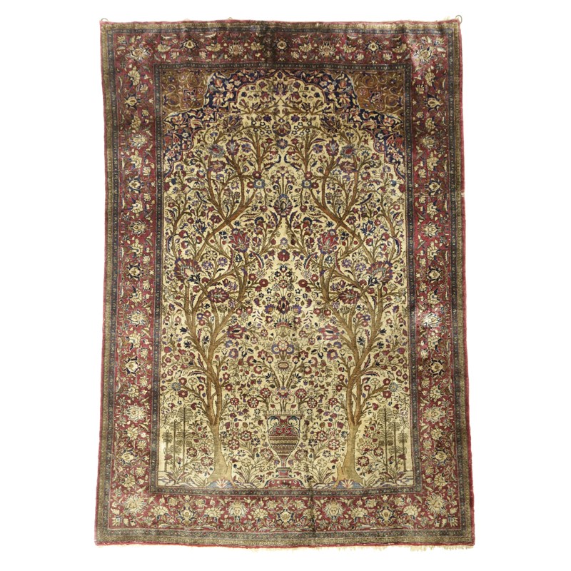 the ivory field with an urn issuing flowers, flanked by two trees, beneath a cusped Mihrab, framed by pale aubergine borders of palmettes and vines, flanked by indigo carnation guard stripes
