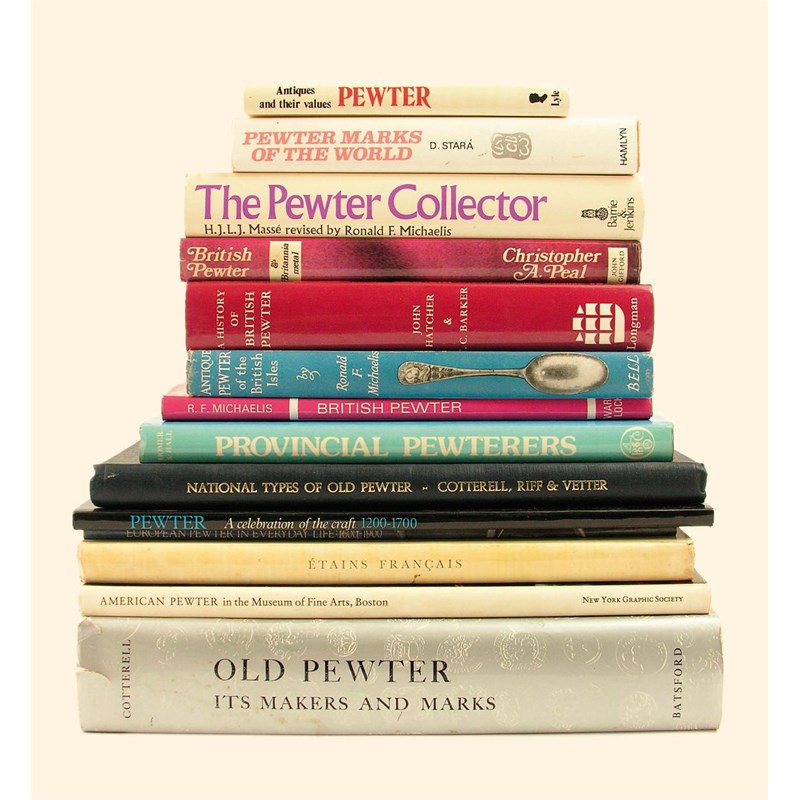 Howard Herschel Cotterell. Old Pewter, Its Makers and Marks, 1964; Christopher A Peal. British Pewter & Britannia metal, 1971; H.J.L.J.Masse. The Pewter Collector, 1971; Ronald F. Michaelis. Antique Pewter of the British Isles, 1955; Ronald F. Michaelis. British Pewter, 1969; R.F. Homer & D.W. Hall, Provincial Pewterers, 1985; Cotterell, Riff & Vetter. National Types of Old Pewter, 1935; John Hatcher & T C Barker. A History of British Pewter, 1974; D.Stara. Pewter Marks of the World, 1978; Tony Curtis. Antiques and their values, Pewter, 1978; American Pewter in the Museum of Fine Arts Boston, 1974; B A Douroff. Etains Francais; Pewter A celebration of the craft 1200-1700; European Pewter in Everyday Life (1600-1900). (14)