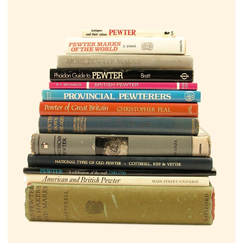 Howard Herschel Cotterell. Old Pewter Its Makers & Marks, 1929; Christopher A Peal. More Pewter Marks, 1976, Addenda to More Pewter Marks, 1977; J B Kerfoot. American Pewter, Bonanza Books; Cotterell, Riff & Vetter. National Types of Old Pewter, 1972; Cotterell. Pewter Down the Ages, 1932; J C Thomas. American and British Pewter, 1972; V Brett. Phaidon Guide to Pewter, 1981; R F Michaelis. British Pewter, 1969; R F Homer & D W Hall. Provincial Pewterers, 1985; C Peal. Pewter of Great Britain, 1983; T Curtis. Antiques and their Values, Pewter. D Stara. Pewter Marks of the World, 1978; Pewter A celebration of the craft 1200-1700, Exhibition Catalogue. (14)