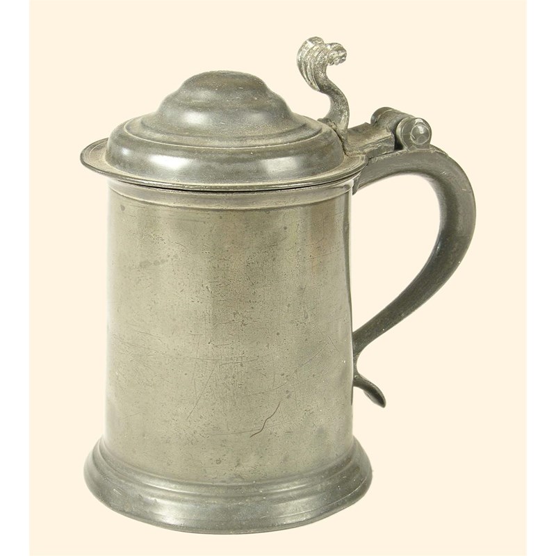 An early 18th century pewter lidded tankard, with a cylindrical drum, double domed lid with a scroll thumpiece, touchmark inside base 'IB within a heart', 7in (17.5cm) h.