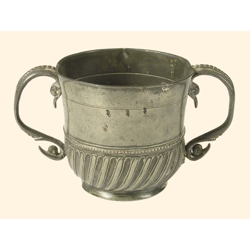 A pewter two handled cup, c.1700, with a part gadrooned body and a pair of part bead scroll handles with bird's head terminals, the body with 'hallmarks' of 'G above a fleur-de-lys', 3.75in (9.5cm) h.