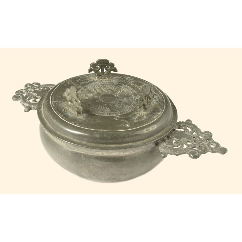 A William and Mary pewter lidded porringer by Samuel Lawrence, the ears with dolphin supporters, one missing its tip, touch to reverse (MPM 2863a), the interior with a cast relief medallion with a bust of William III with a crown and orb, the lid with cast relief decoration with busts of William and Mary, with a crown above flanked by angels, the centre with a circle framing HONI SOIT QUI MAL Y PENSE, to WM monograms and royal arms, the whole with three applied knops of a crown with cherub supporters, one replaced, c.1689 - 1694, 4in (10cm) h, 10.5in (26.5cm) wide overall. For similar see The Worshipful Company of Pewterers, Supplementary Catalogue, p.65 & 73.
