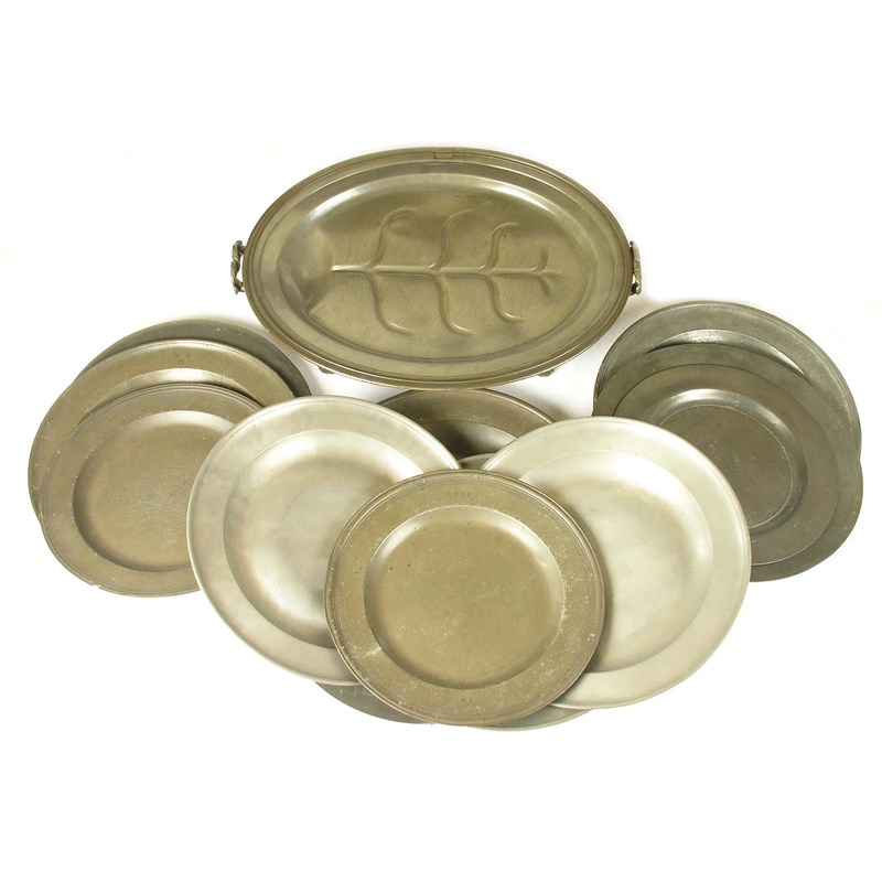 A Victorian pewter oval welled meat dish, 25.5in (65cm) w., and thirteen pewter chargers, 18th and 19th century, some with owners initials, one with a Talbot crest, the largest 18.25in (46cm) dia. (14)
