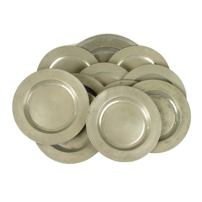 A matched set of ten pewter side plates, 10in (25.5cm) dia., six with touch marks 'P & D LONDON', four by William James Englefield (Cott 1576), and a small pewter charger, with touch marks and owners initials, 13.75in (35cm) dia. (11)