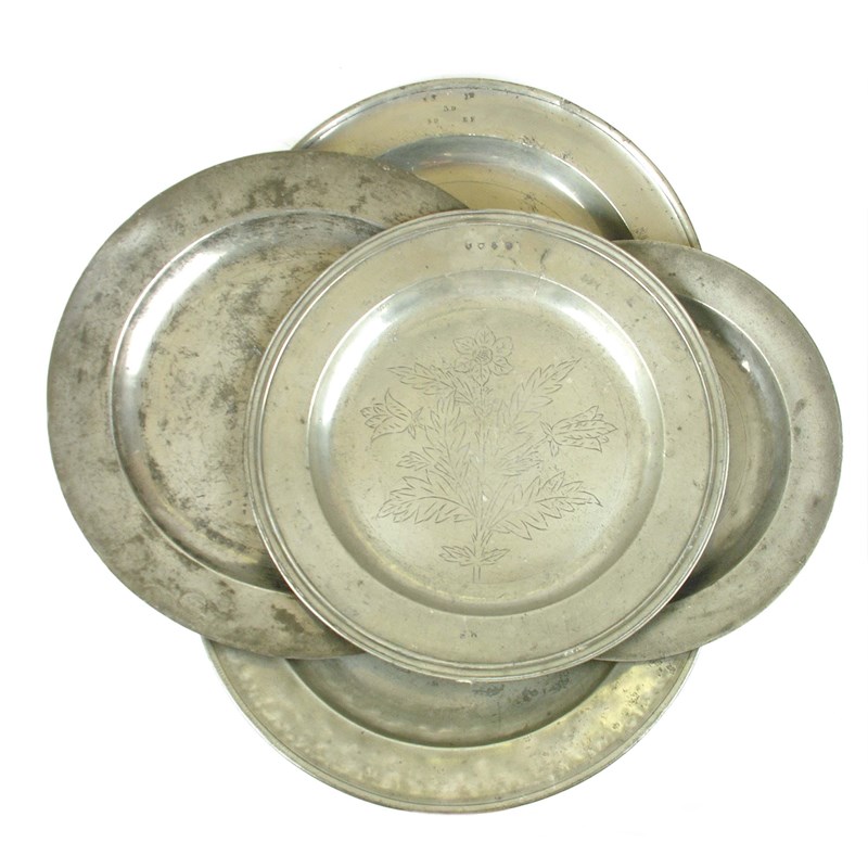 An 18th century pewter charger, decorated a floral design, worn touch marks, 16.5in (42cm) dia., three pewter chargers, 18in (46cm) dia., a smaller charger and a Victorian spouted pint measure. (5)