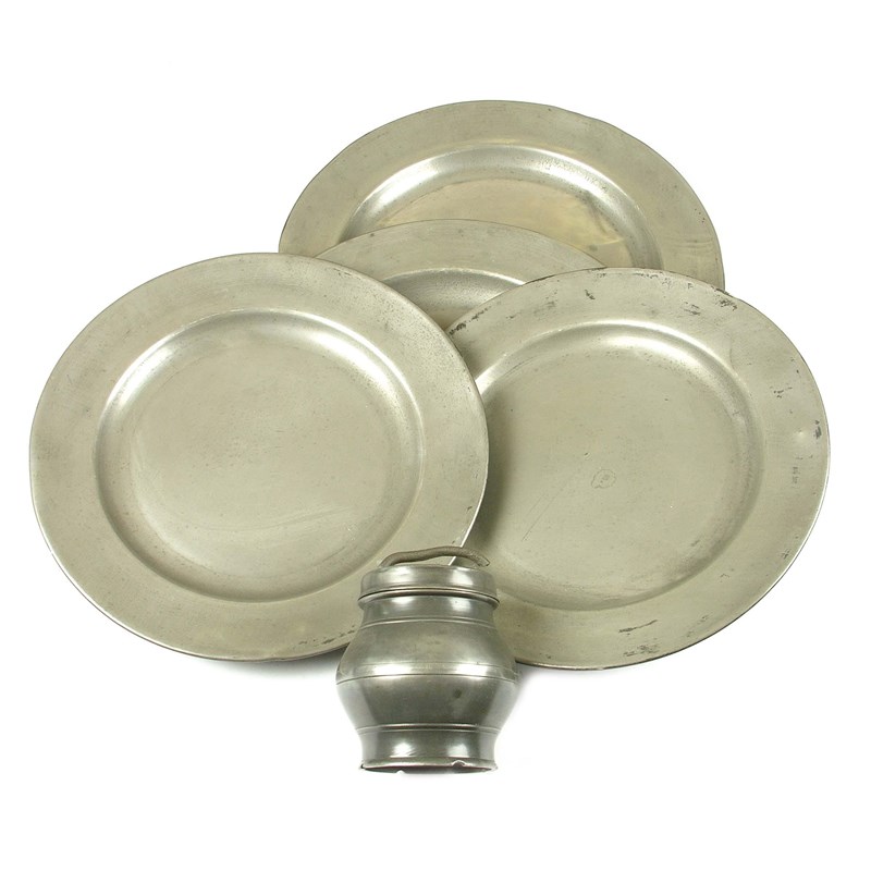 A pair of pewter chargers, touch marks for 'P & D London', 15.75in (40cm) dia., a pair of smaller chargers by the same maker and a pewter tobacco jar. (5)