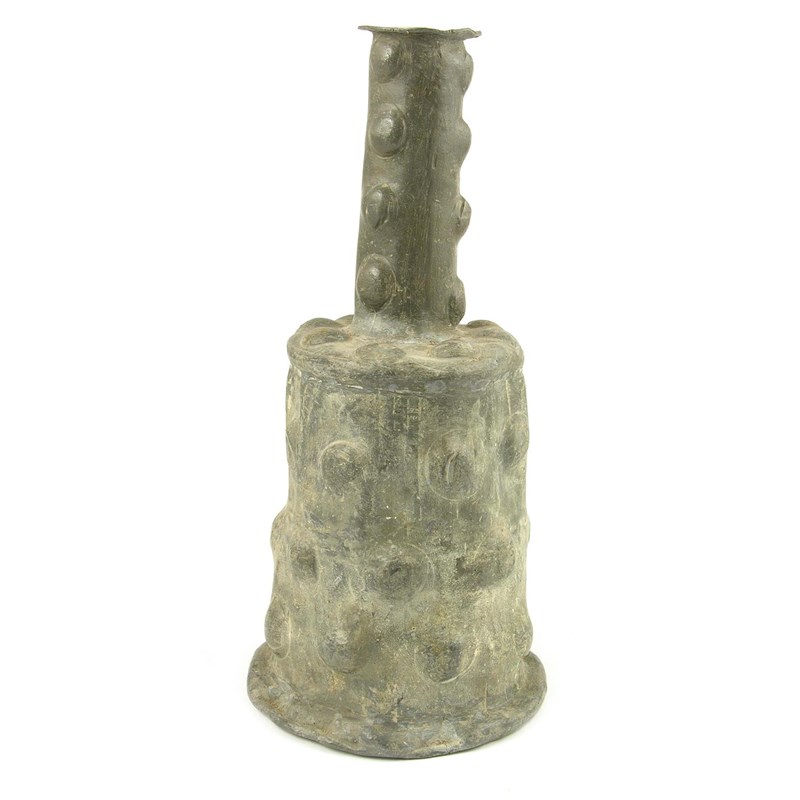 An unusual lead mallet shaped vessel, with allover embossed beads, the underside engraved an 'R', probably 18th century, 11.5in (28cm) h.
