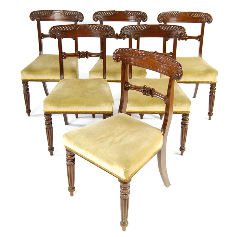 Six mahogany dining chairs, each with a curved and leaf carved top rail with rosette ears above a horizontal splat, the stuffed-over seat on turned and ribbed tapering legs, three early 19th century, three modern copies. (6)