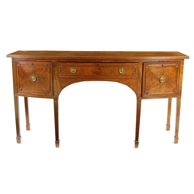 A mahogany bowfront sideboard, with a reeded edge above a central frieze drawer, flanked by two deep drawers, fitted later brass handles, 19th century, 38in (96.5cm) h, 72in (103cm) w, 21.5in (54.5cm) d. With three repairs to the legs.