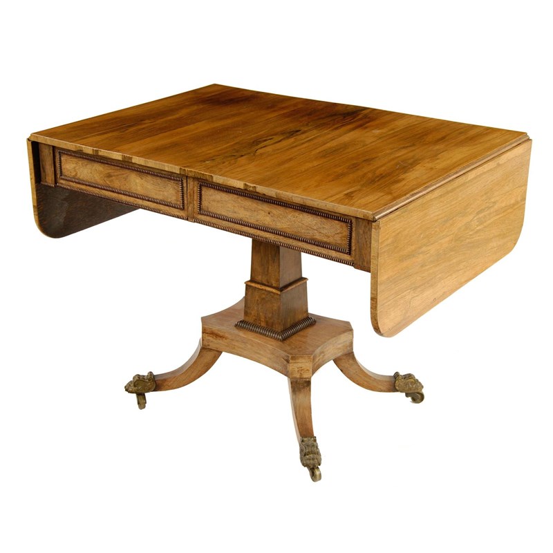 A George IV rosewood sofa table, with nulled mouldings, the twin-flap top above a pair of frieze drawers, on a stepped stem and downswept supports, terminating in brass paw sabots and castors, 28in (71cm) h, 38in (96.5cm) w, 27in (68.5cm) d.