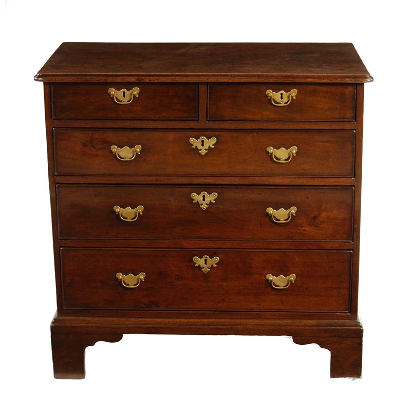 A George II mahogany chest, the moulded edge top above two short and three long graduated drawers fitted replaced handles and escutcheons on later bracket feet, 33.75in (85.5cm) h, 34in (86cm) w, 18.5in (47cm) d.