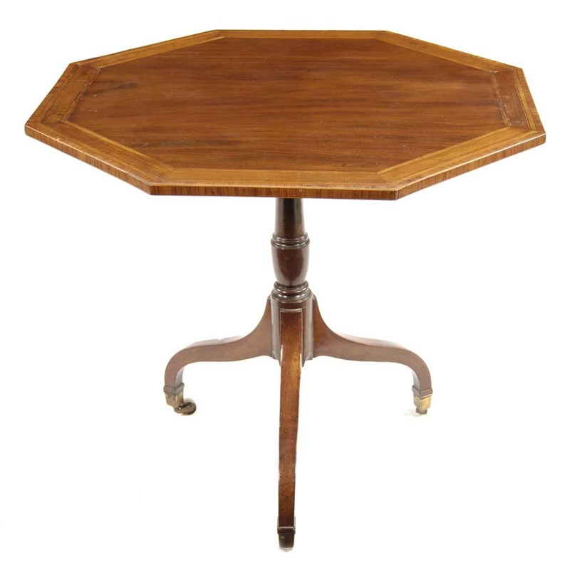A late George III mahogany tripod table, the octagonal tilt-top satinwood and kingwood banded, on an urn and ring turned stem and downswept legs terminating in brass caps and castors, 28in (71cm) h, 32.75in (83.3cm) w.