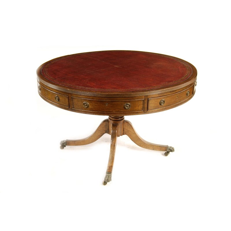 A mahogany drum table in Regency style, the reeded edge top inset gilt tooled red leather above four frieze drawers and four dummy drawers fitted replaced handles, on a turned stem and downswept supports terminating in lion's paw sabot and brass castors, early 20th century, 29.5in (74.8cm) h, 46.25in (117.5cm) dia.