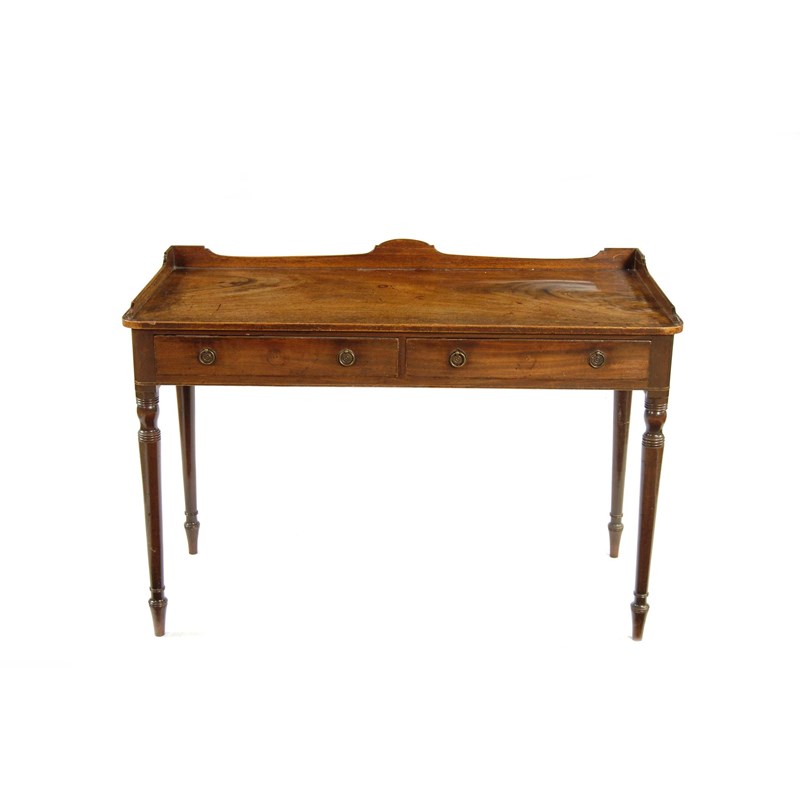An early 19th century mahogany side table, with a shaped 3/4 gallery above two frieze drawers, one divided both with later handles on ring turned tapering legs, 33.5in (85cm) h, 47.25in (120cm) w, 21.25in (54cm) d.