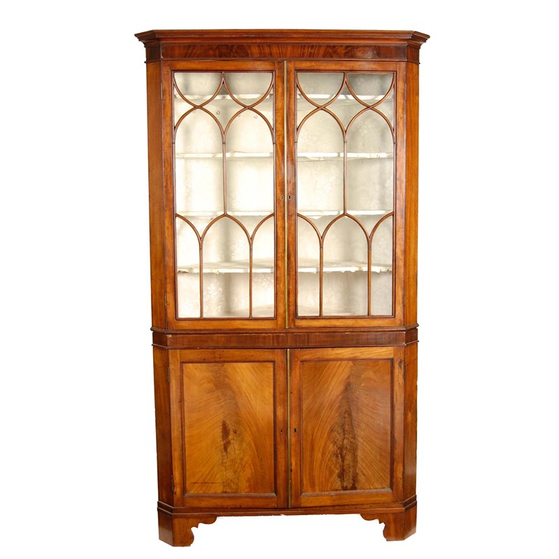 An early 19th century mahogany standing corner cupboard, having a pair of astragal glazed doors enclosing four serpentine front shelves, later papered, the base with a pair of rectangular panel cupboard doors enclosing a shelf, 84.25in (214cm) h, 48in (122cm) w, 25.5in (65cm) d.