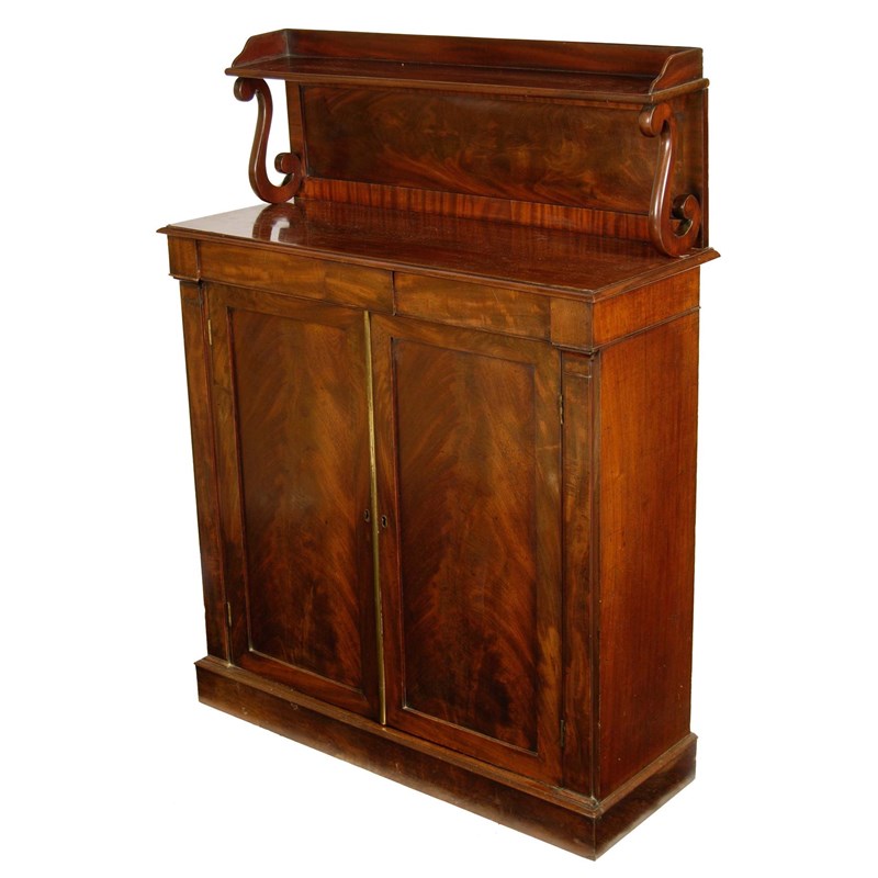 A George IV mahogany chiffonier, the raised gallery back with 'S' scroll supports above two frieze drawers and a pair of cupboard doors enclosing shelves, the reverse with a stencilled label 'M.T.SPENCER', 49in (124cm) h, 36.5in (93cm) w, 13.75in (35cm) d.