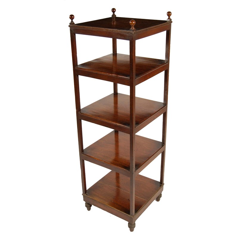 An early 19th century mahogany six tier whatnot, with ball finials, the reeded edge top on square supports and ring turned feet, 51.5in (130.8cm) h, 16.25in (41cm) w.