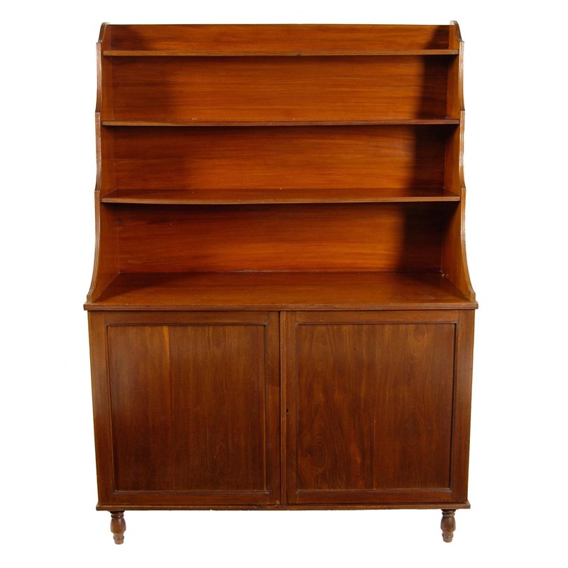 A mahogany waterfall bookcase cabinet, three graduated shelves and shaped supports, with, reeded fronts above a pair of cupboard doors enclosing a divided interior with a shelf, on turned feet, 19th century, 68in (173cm) h, 48.25in (122.5cm) w, 20.25in (51.5cm) d.