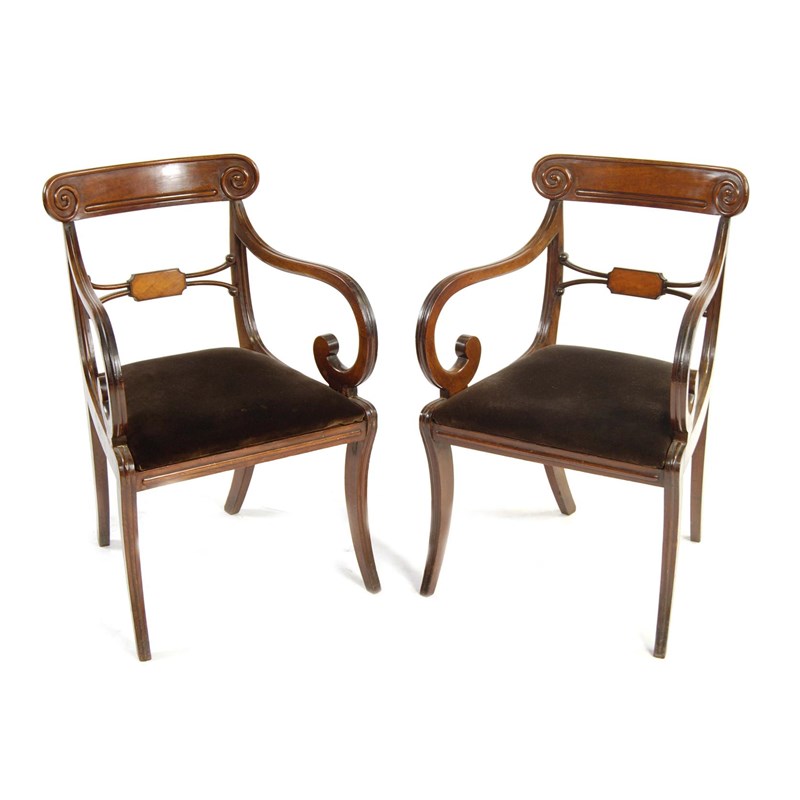A pair of George IV mahogany open armchairs, each with a curved and scroll top rail with a horizontal splat back centred a rectangular tablet with incurved corners, with scroll arms to a drop-in seat on sabre legs. (2) Repairs.