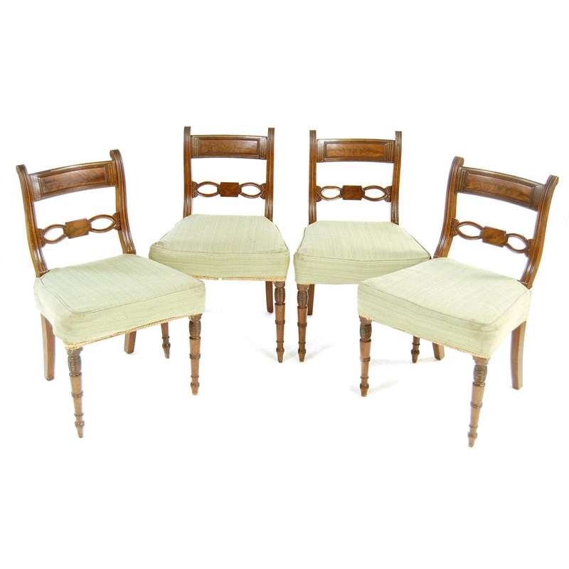 A set of four early 19th century mahogany dining chairs, each with a curved brass inlaid top rail to a stuffed-over seat and ring turned front supports. (4)