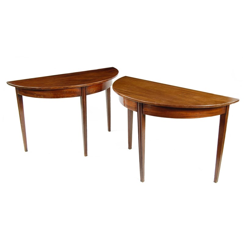 A pair of mahogany demi-lune console tables, each on channelled square tapering legs, formerly the ends of a George III dining table, 28.5in (72.2cm) h, 44.5in (113.3cm) w, 20in (50.7cm) d. (2)