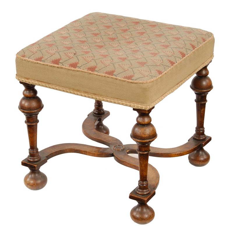 A walnut foot stool in William & Mary style, the tapestry upholstered seat on turned supports united by an 'X' stretcher, 17in (43cm) h, 17.25in (43.7cm) w.