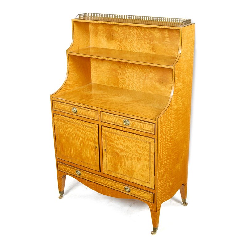 A satinwood open bookcase cabinet in George III style, inlaid ebonised stringing, the galleried top above two open shelves with two frieze drawers above cupboards and a lower drawer, on square tapering legs, brass caps and castors, 45in (114.3cm) h, 29in (73.8cm) w, 15in (38cm) d.
