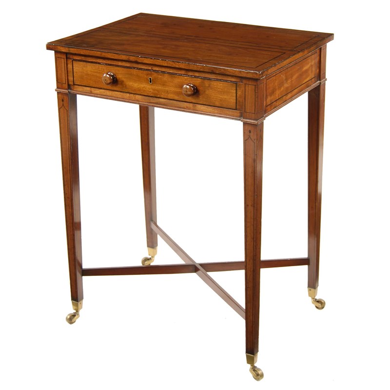 A Regency mahogany side table, inlaid ebonised stringing with a frieze drawer above square tapering legs united an 'X' stretcher on brass caps and castors, 29.5in (75cm) h, 22in (56cm) w, 16in (40.6cm) d.